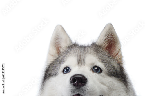 © Anna Averianova, Obraz premium Siberian Husky with blue eyes. dog on a white background . Obedient pet