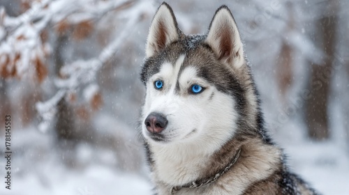 © Anat art, Naklejka premium Siberian Husky With Striking Blue Eyes Enjoying a Winter Day in Soft Snow