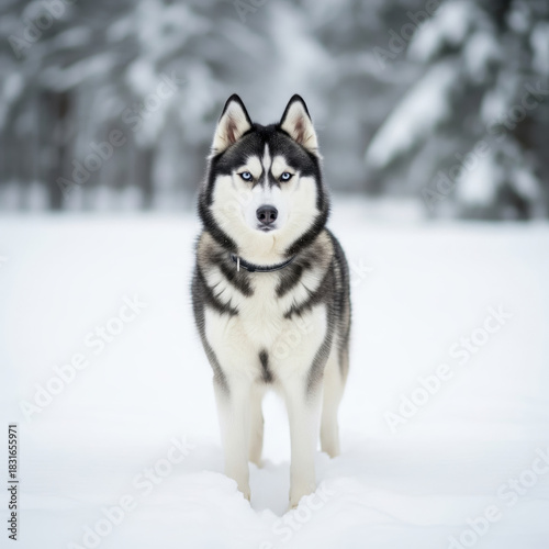 Naklejka premium Siberian Husky with Striking Blue Eyes Standing in Snowy Landscape Surrounded...