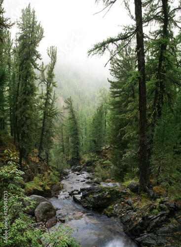 Fototapeta premium Siberian taiga, dense forest, conifers. A stream in the rocky shores. Natural...