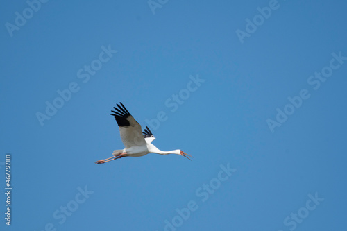© 雅文 大石, Fototapeta premium Siberian white crane flying in blue sky