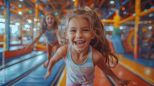 Obraz premium Siblings Practicing Synchronized Jumps on Trampolines with Cheerful Expressions in Clear Indoor Environment