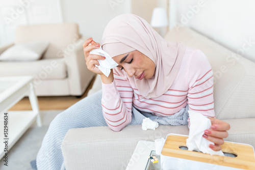 © Graphicroyalty, Fototapeta premium Sick day at home. Young Arabic woman has runny and common cold. Cough. Closeup Of Beautiful Young Woman with hijab Caught Cold Or Flu Illness.