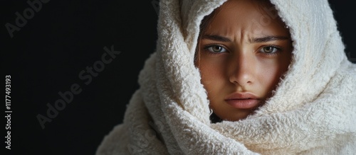 © The 2R Artificiality, Obraz premium Sick Young Woman Wrapped in White Blanket with Concerned Expression, Indoor Natural Light, Emotional Cold and Flu Concept on Dark Background