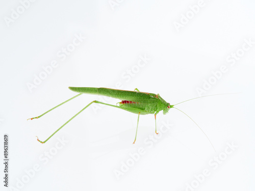 Fototapeta premium Sickle-bearing Bush-cricket in a white background. Genus Phaneroptera