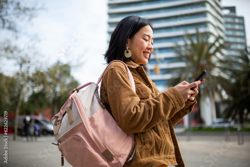 Fototapeta premium Side portrait of student with bag looking at mobile phone