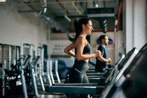 Fototapeta premium Side profile of a female running on a treadmill at the gym, a male running in the background.