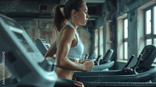 © Dao, Fototapeta premium Side profile of a fit girl running on a treadmill at the gym.