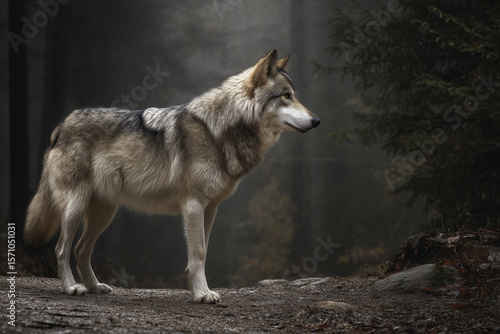 © Arti, Fototapeta premium Side profile of a gray wolf walking along a forest trail in side lighting