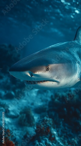 © MDJAHIDULISLAM, Naklejka premium Side profile of a tiger shark in deep blue ocean water