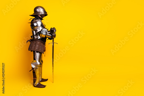 © deagreez, Fototapeta premium Side profile of an armored knight with sword against vibrant yellow background depicting historical chivalry