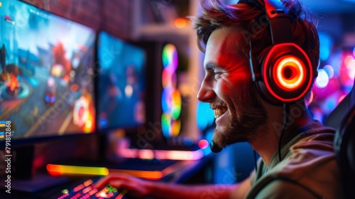 © Picza Booth, Fototapeta premium Side profile of male pro gamer in joyful triumph, glowing LED headphones highlighting gaming success, Concept of digital victory, online gaming passion, and esports entertainment.