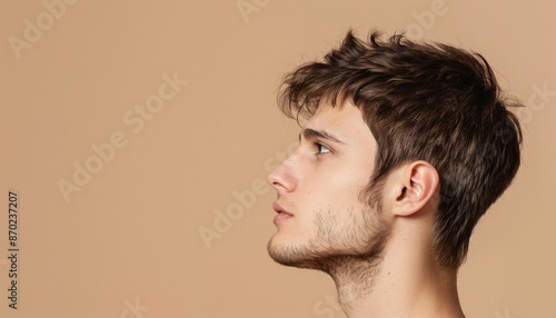 Fototapeta premium Side Profile of Young Man on Warm Beige Background, Copy Space, Banner