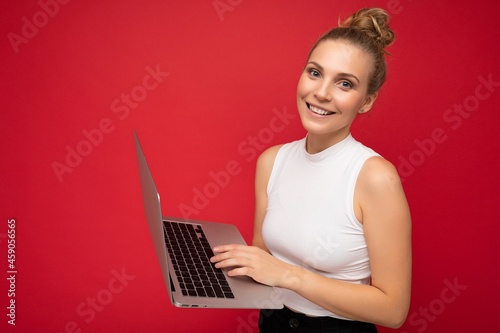 © Ivan Traimak, Naklejka premium Side profile photo shot of beautiful smiling blond young woman with gathered hair wearing white t-shirt holding computer laptop typing on keyboard looking at camera isolated over red wall background