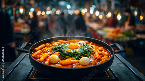 © Hammad, Fototapeta premium Side shot of tteokbokki with fish cakes and boiled eggs, glossy red sauce dripping, blurred vibrant street market