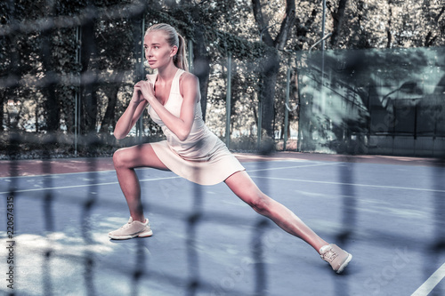 Fototapeta premium Side shuffles. Earnest female player focusing on training and stretching