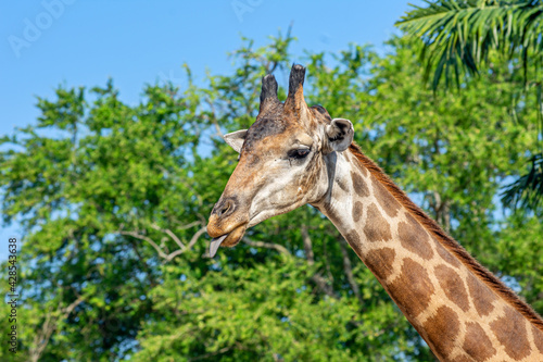 © Валерий Моисеев, Fototapeta premium Side view close-up of a giraffe in front of some green trees