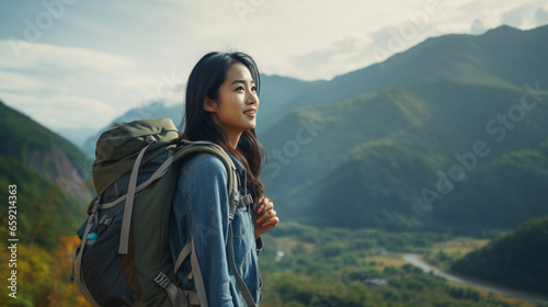 © BranchandStick, Naklejka premium Side view happy young asian traveler woman carrying backpack. Mountains background