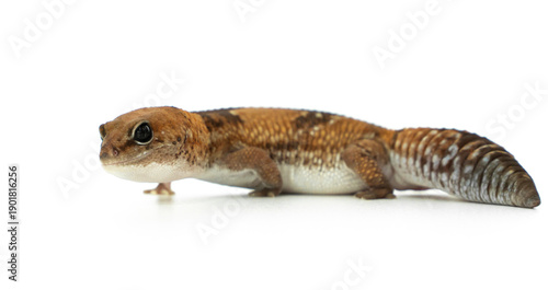Obraz premium Side View of a Captive African Fat-Tailed Gecko Isolated on White Background...