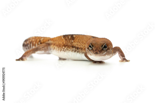 Obraz premium Side View of a Captive African Fat-Tailed Gecko Isolated on White Background...