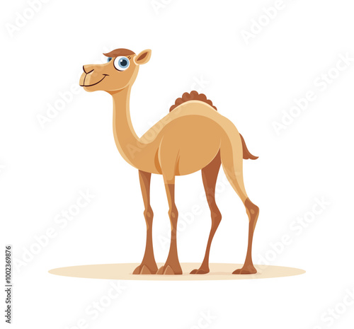 © Ashiyana, Naklejka premium Side view of a cartoon camel standing sideways, with a cheerful expression and long legs. The camel is light brown and appears friendly and playful.