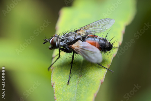 Fototapeta premium Side view of a fly of the genus Eriothrix perched across a green leaf.