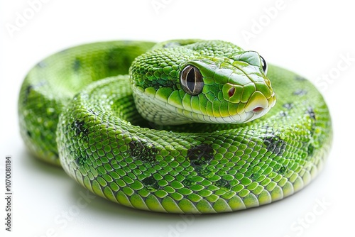 Fototapeta premium Side view of a green snake coiled in a graceful curve isolated on a white background. Generative AI