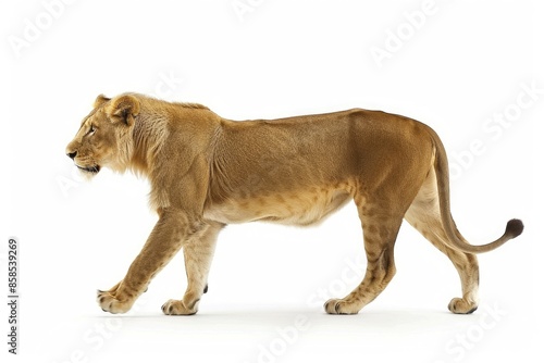© darshika, Obraz premium Side view of a lion walking away isolated on white