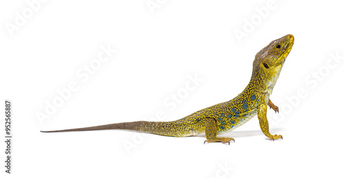 © Eric Isselée, Naklejka premium Side view of a Ocellated lizard, Timon lepidus, standing and looking up, isolated on white