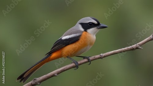 © titik, Fototapeta premium Side view of a perched bird with orange, gray, and black plumage on a branch.