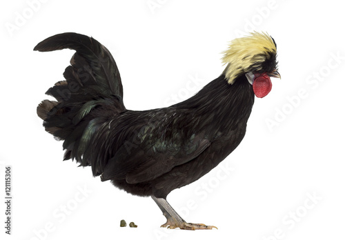 Fototapeta premium Side view of a Polish rooster defecating on white background