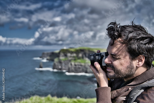 Obraz premium Side view of a professional photographer taking pictures of seascape