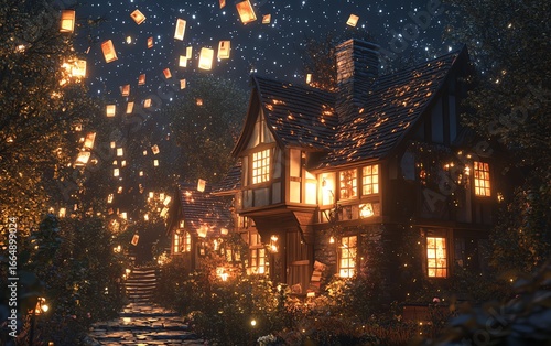 © Amp&BoY Studio, Naklejka premium Side view of a quaint farm with glowing books floating in the air, illuminating the night sky, bridging old and new, magical harmony