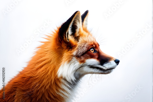 © Linggakun, Fototapeta premium Side view of a Red fox looking up, two years old, isolated on white