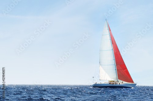 © MDBPIXS, Naklejka premium Side view of a sailboat in the peaceful blue ocean against sky