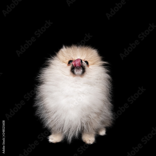 © Vaceslav Romanov, Naklejka premium Side view of a sitting pomeranian spitz isolated on a black background