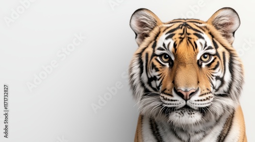 Fototapeta premium Side view of a tiger with striking features and intense gaze against a white...