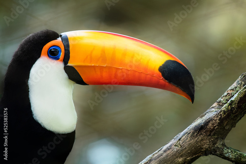 © anniehall, Fototapeta premium side view of a toco toucan with an orange and yellow beak looking at the camera on a natural background