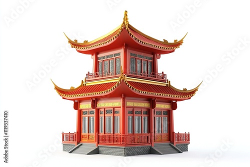 © ILIUSIA, Fototapeta premium Side view of a traditional Chinese pagoda with bold red walls and golden accents, detailed with intricate patterns.