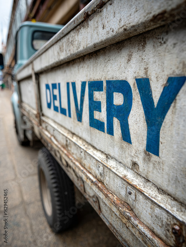 © SashaMagic, Obraz premium Side view of a vintage delivery truck in an urban setting