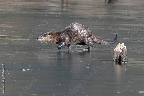 Fototapeta premium Side view of an adorable wet North American river otter running in shallow water