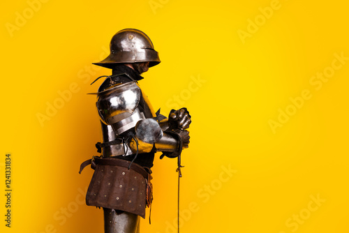 Naklejka premium Side view of an armored knight in full metallic gear holding a sword against a vibrant yellow background