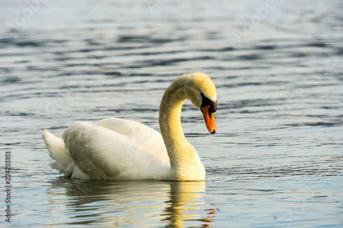© Simon Dux Media, Naklejka premium Side view of beautiful swan on silent water