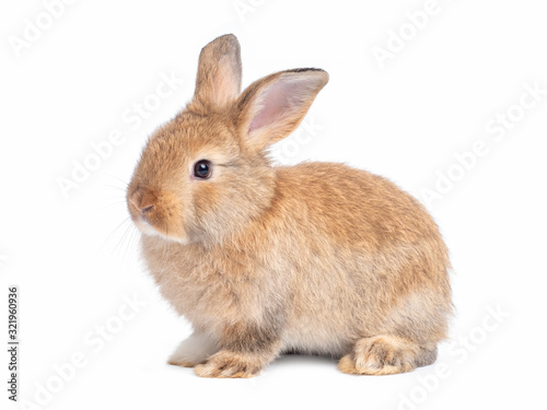 Obraz premium Side view of brown cute baby rabbit sitting isolated on white background.