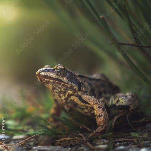 Fototapeta premium Side view of Common frog (Rana temporaria) sitting on forest floor in natural habitat. Close up shot