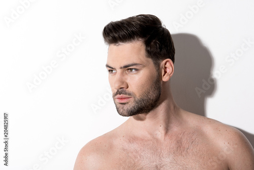 © Yakobchuk Olena, Naklejka premium Side view of gorgeous young bearded naked man is standing and looking aside thoughtfully. Copy space in the left side. Beauty concept