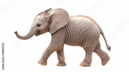 © naina , Obraz premium side view of grey baby elephant walking on isolated white background.ai