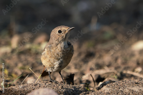 © JGade, Fototapeta premium Side view of juvenile common redstart bird sitting on the ground with brown dirt background