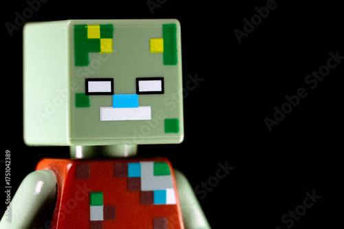 © Klochkov, Naklejka premium Side view of LEGO Minecraft Drowned face on a black background