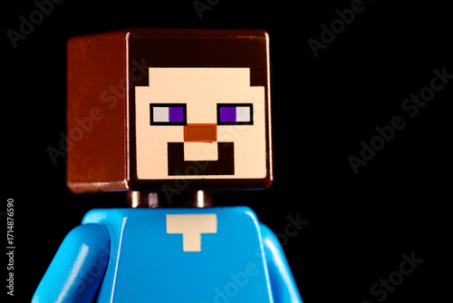 © Klochkov, Obraz premium Side view of LEGO Minecraft Steve face closeup on a black background